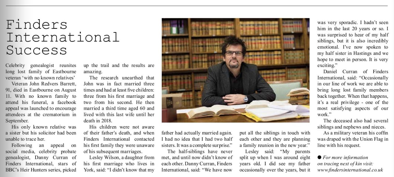 Finders International have been recognised in this months edition of the Eastbourne Voice for their work in reuniting relatives of the late Veteran John Redvers Barrett. A rewarding completion to yet another success story.